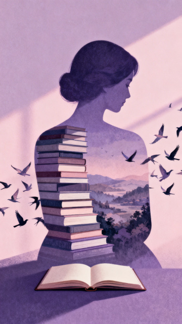 清新插画风,双重曝光融入超现实主义,水彩质感展现书中山水与飞翔的鸟儿。