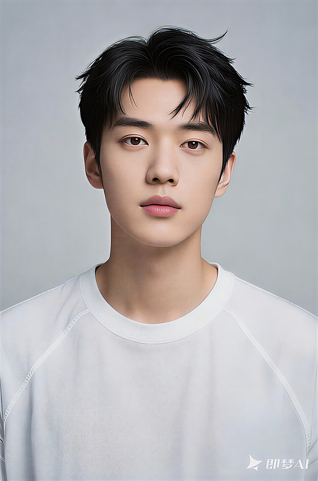人像摄影,年轻韩国男生模特,20岁左右,精致瓜子脸,超大无辜狗狗眼,眼睛又大又圆,清澈透亮瞳孔,双眼皮清晰,眼神温柔干净,高光明显,皮肤白皙细腻,二八侧分纹理蓬松茶棕色发型,超写实高清,柔和光影,面部精致,干净甜美感,身着浅米色西装外套,内搭白色衬衫,韩国偶像气质,干净且突出主体,面部和头发细节清晰可见,光线柔和,正面半身胸部以上肖像大头照,完全正对镜头,零角度,对称构图,五官对称无不对称,纯白背景,整体呈现简约高级商业广告风格,高清质感细腻光影,优雅甜美氛围详情