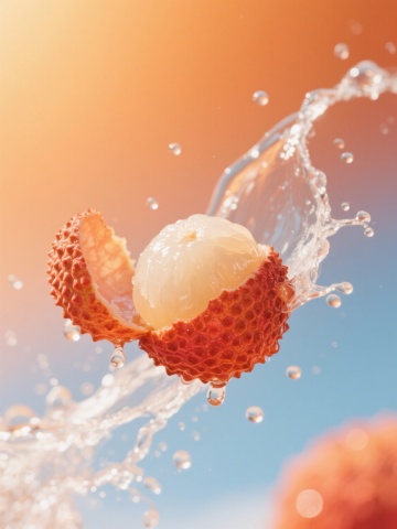 一个被剥开的荔枝,果肉晶莹剔透,果皮呈现出鲜艳的橙红色,果肉和果皮在空中分离,水花四溅,水滴在空中形成优美的弧线,背景是渐变的暖橙色天空,光线明亮,光影对比强烈,具有高度的写实感和动态感,整体画面充满了夏日的活力和水果的新鲜感。