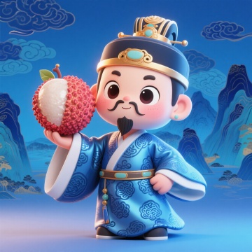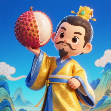 卡通感3D风设计,皇帝手持荔枝,软萌可爱,背景山水清新。