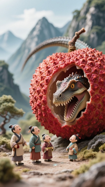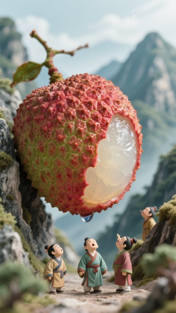 古典中式工笔风,鎏金微缩艺术,超现实主义荔枝山,骑马人物穿梭其间。