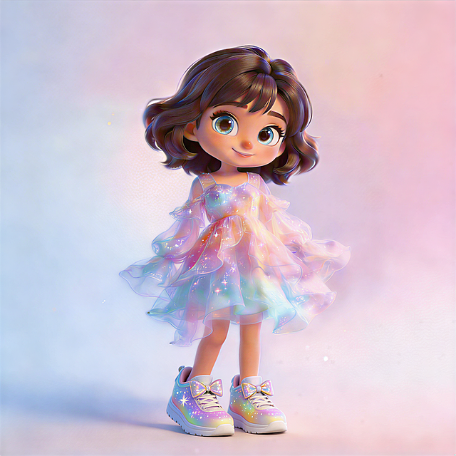 软3D风卡通女孩,可爱感十足,大眼萌态,时尚配饰点缀,梦幻渐变背景。详情