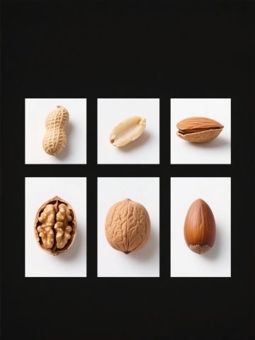 纯白背景上,六个不同形态的坚果类食品以规整网格排布组成的系列素材集合。每个坚果均保持超写实摄影风格,展现细腻的外壳纹理、自然的浅棕色调与精准的光影效果,包括完整带壳花生、剥开的半颗花生、饱满的花生仁、带纹路的核桃、开口的榛子及椭圆形的巴旦木,整体构图平衡对称,单元素材独立清晰且风格统一。