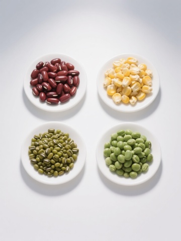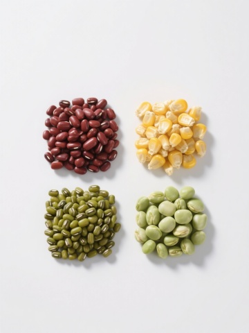 极简现代风格的杂粮谷物系列素材,纯色背景,无文字无logo无水印,每张均以规整对称的几何式排布方式呈现单一品种的杂粮谷物元素,高分辨率3D渲染,超写实质感,清晰的纹理细节,饱满的自然色彩,柔和均匀的光影,主体突出,构图简洁平衡,第一张为带绿色苞叶的完整黄色玉米棒特写。
