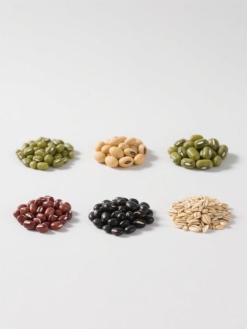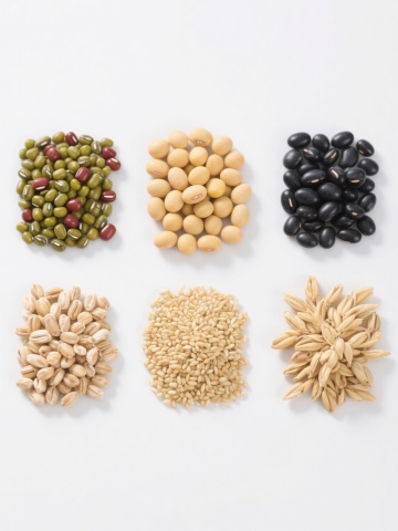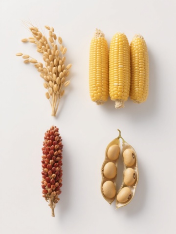 六个不同杂粮谷物(如玉米、小麦、稻谷、高粱、小米、燕麦等)以规整网格排布,每个谷物保持超写实3D质感,表面纹理细腻清晰,色彩鲜艳饱和,带有自然光泽和柔和阴影,整体造型简约现代,置于纯白色纯色背景上,无任何文字、logo及水印,风格统一和谐。