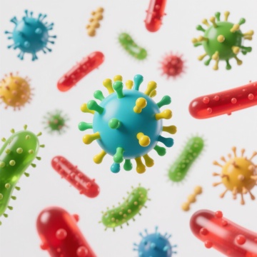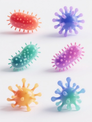 6个不同配色、不同品种、不同造型的细菌素材集合,每个细菌都具有3D写实风格,表面有细腻的纹理和凸起,周围环绕着透明的、带有轻微光泽和折射效果的圆形透明包膜,整体采用纯色背景,细菌们被规整地排布在画面中,保持统一的光照效果,每个细菌都有独特的色彩搭配和形态特征,有的呈球形带有多个突起,有的呈杆状带有鞭毛,有的则具有复杂的多面体结构,整体画面清晰、科学、具有高度的细节表现力。