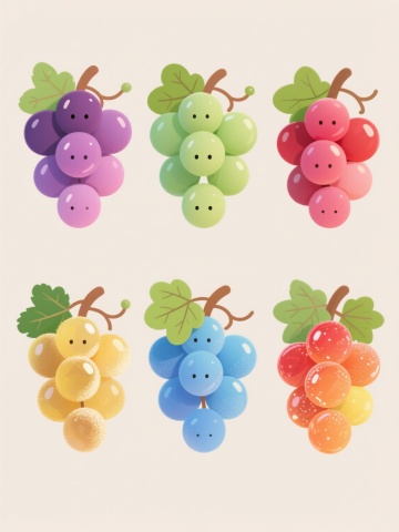手绘插画风,六个不同配色、不同样式、不同材质的葡萄造型,上下两行对齐排列,浅色背景。整体采用圆润可爱的卡通风格,线条简洁流畅,色彩明快鲜亮。每串葡萄都有独特的颜色搭配,如深紫配浅紫、翠绿配淡绿、酒红配粉红、金黄配浅黄、靛蓝配天蓝、橙红配橙黄等。葡萄果实饱满圆润,表面有高光点缀,呈现出不同的材质感,有的光滑如釉质,有的带有细微绒毛,有的半透明似果冻,有的带磨砂质感,有的有糖霜效果,有的则像晶莹剔透的宝石。每串葡萄都带有绿色的叶子和棕色的藤蔓,叶子边缘有简单的锯齿,叶脉清晰可见。整体构图平衡,葡萄串大小略有变化,避免单调,所有元素在浅色背景上显得清新明快,充满童趣和活力。
