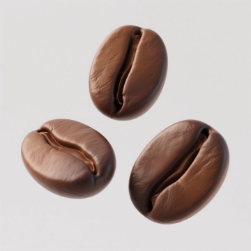 三颗精致的软3D风格咖啡豆,呈现出温暖的深棕色渐变,表面光滑带有细腻的光泽感和轻微的纹理起伏,豆体饱满圆润,中央有自然的裂缝,裂缝处透出更深的褐色。咖啡豆以不规则的三角形布局悬浮在纯白色背景上,整体光影柔和,高光集中在豆体顶部边缘,阴影浅淡且边缘模糊,营造出轻盈、简洁而富有立体感的视觉效果,设计风格现代简约,具有清晰的视觉焦点和高效的信息传达。