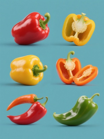 六个完全不同的彩色辣椒及彩椒元素的集合,保持高写实摄影风格,每个辣椒/彩椒拥有饱满光滑的质感、清晰的纹理细节和自然的高光阴影,色彩鲜艳饱和(包含红色、黄色、橙色、绿色等不同彩椒颜色),形态各异(如完整的、切开的、不同朝向的、不同品种的辣椒/彩椒),在纯色背景上呈规整网格状排布,无任何文字、LOGO、二维码及额外装饰元素,整体画面简洁明快,突出蔬菜的新鲜与真实感,符合高质量食品素材的视觉标准。