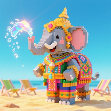 像素风卡通大象,拟人化设计,沙滩上喷水嬉戏,色彩斑斓,夏日欢乐氛围。