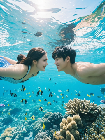 梦幻清新,浪漫动漫风,虚拟现实超现实主义,水中金鱼环绕,笑容灿烂。