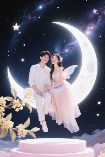 银河星系浪漫背景、星星点缀,帅哥与仙女妆美女坐在月亮上,他们相依偎,微笑着。整体偏上,前景有桂花点缀,桂花下有梦幻甜蜜粉白展台#七夕浪漫企划