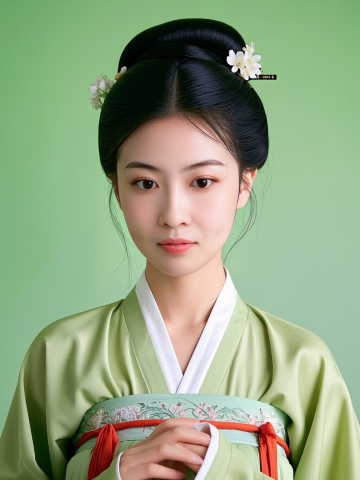 一名身穿绿色系汉服的女生,中式发饰,皮肤纹理清晰,高清商业摄影,半身照,人物特征保持