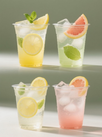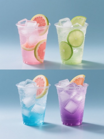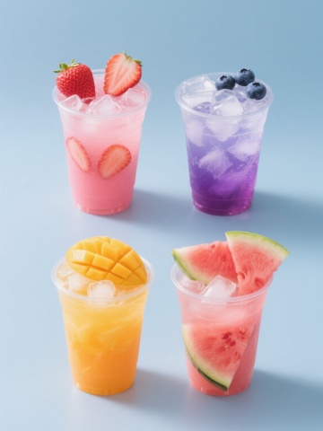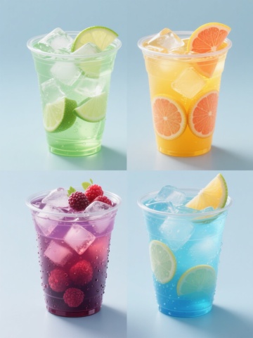 白色背景上,6个完全不同造型的同系列透明塑料杯饮品素材集合规整排布,保持超写实摄影风格,光影明亮通透,杯身和液体有清晰的高光和阴影细节,冰块棱角分明且有透明质感,每个杯子中分别装有不同色彩和元素的饮品:1. 粉红色草莓冰饮,杯口装饰草莓片和薄荷叶,杯壁贴有对半切开的草莓;2. 青绿色猕猴桃冰沙,顶部有猕猴桃果肉块和奇异果切片,杯侧插着小绿叶;3. 紫色葡萄苏打水,杯中漂浮着整颗葡萄和葡萄切片,杯口放有葡萄串装饰;4. 橙色芒果冰茶,杯内有大块芒果果肉和芒果片,杯口斜插芒果角;5. 淡蓝色蓝莓气泡水,杯底沉着蓝莓,杯口装饰蓝莓和迷迭香;6. 浅绿色青柠莫吉托,含青柠片和薄荷叶,杯口插青柠角,液体清澈有气泡,整体构图平衡,每个饮品造型独特,色彩鲜明,细节丰富,适合作为系列饮品宣传素材。