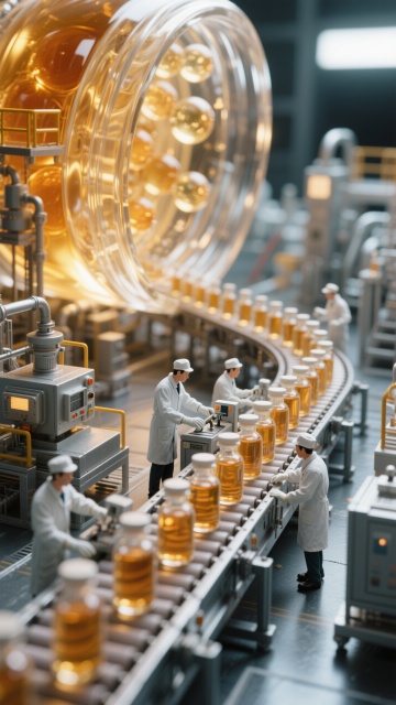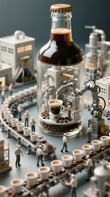 科技感十足的微缩艺术风,瓶中工厂展现未来工业美学,超现实主义设计手法。
