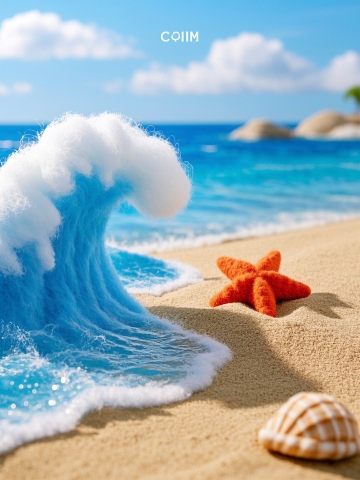 清新梦幻的插画风微缩艺术,毛发生长风海浪与沙滩上的可爱海星,营造夏日海边的童话氛围。