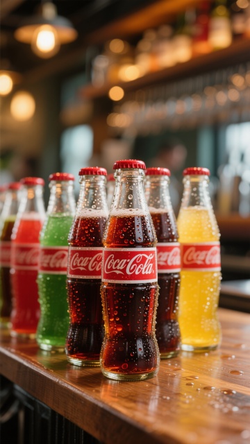 超写实风格摄影,特写镜头下的餐饮店吧台场景,冰镇的多瓶不同口味可口可乐玻璃瓶(经典红色、绿色、黄色瓶身,红色瓶盖,瓶身布满晶莹水珠与细密气泡)整齐排列在吧台上,背景可见模糊的餐饮店暖色调灯光与木质桌面纹理,整体光影柔和,色彩浓郁饱和,瓶身液体折射出诱人光泽,水珠欲滴的清凉质感,营造出夏日饮品的清爽氛围与餐饮店的温馨格调,画面聚焦可乐瓶细节,保持高度清晰的材质表现与真实的水珠光影效果。