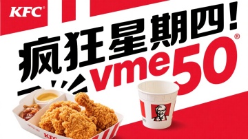 疯狂星期四的营销海报,大标题是“疯狂星期四vme50”,左上角是红白相间的“KFC”,主图是一个炸鸡套餐