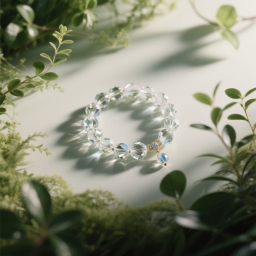 这是一张被一束阳光照射的产品的高分辨率照片,逼真的摄影,将一串手链放在郁郁葱葱的草地上。草地上点缀着鲜艳的黄色花朵,为现场增添了活力。手串用浅色和阴影铸造,位于左侧的大而光滑的灰色岩石上。岩石在前景中的突出位置为手链产品提供了自然,稳定的表面。背景充满了郁郁葱葱的绿叶,各种深浅不一的绿叶和树枝营造出郁郁葱葱的森林般的氛围。穿过树木的光线投下柔和的阴影,增强了自然和宁静的氛围。草的颗粒非常细,可以看到单独的叶子,岩石表面光滑且抛光。整个场景充满了丰富的自然元素,气氛平静祥和,强调科技与自然的和谐。