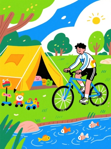 清新插画风,卡通拟人角色,帐篷旁骑车少年,营造欢乐露营氛围。