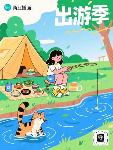 插画,韩国漫画,扁平风格,春天露营海报,运动风,户外露营帐篷,一个甜美女孩子在河边钓鱼,旁边有一些吃的。孟菲斯艺术风格,线条狸花猫在河里游玩,高饱和度颜色,粗线条的笔触,文字“出游季”