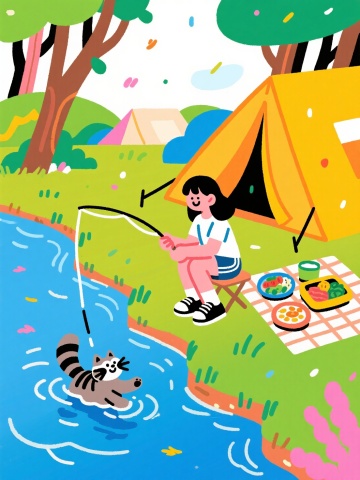 清新插画风,卡通拟人设计,波普艺术色彩,展现户外露营与钓鱼的欢乐时光。