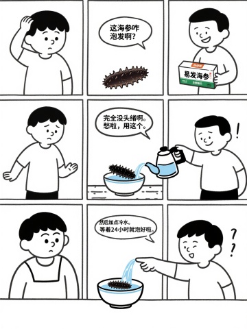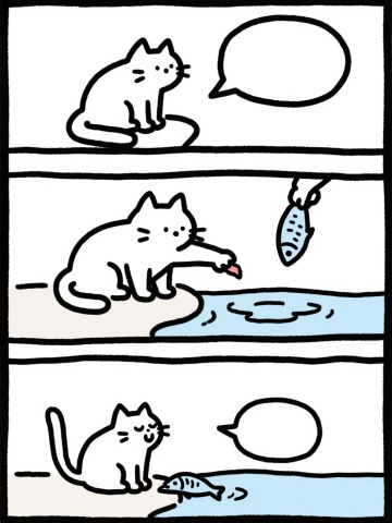 卡通感插画风,漫画式分镜展现猫咪钓鱼的趣味瞬间,简洁线条传达欢乐氛围。