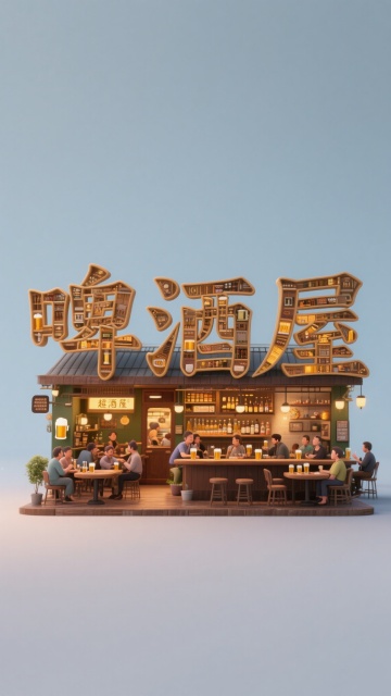 一个用麦穗做成的“精酿啤酒”大字,麦穗呈现光泽,背景是居酒屋