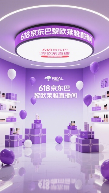 梦幻紫调3D空间,轻拟物风礼盒与气球点缀,霓虹灯效强化促销氛围,极繁主义陈列呈现时尚甜蜜感,虚拟现实感十足的618直播场景。