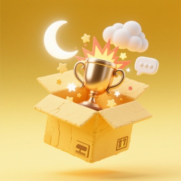粘土,金色奖杯在礼盒中闪耀,配以月亮、星星和云朵