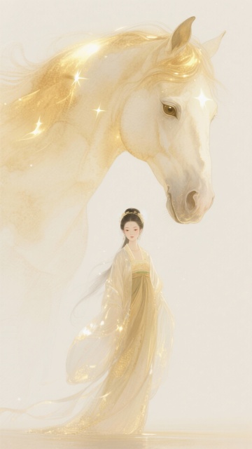 梦幻光影中,古典仕女与鎏金白马共舞,工笔细腻,水彩晕染,唯美感与优雅感交织,中式意境如诗如画。
