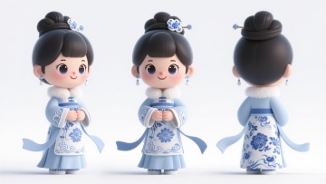 软3D风可爱卡通女孩,身着古风服饰,色彩柔和,童趣盎然。