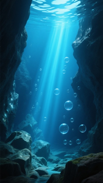 超写实水下洞穴场景,顶部水面透入强烈的蓝色光束,光线在水中形成清晰的光柱并照亮洞穴内部,悬浮着大小不一的透明气泡,底部布满形态变换后的奇特岩石结构,整体色调以深蓝和青色为主,光影对比强烈,营造出神秘而宁静的氛围,岩石表面细节丰富,具有湿润的质感,光线在岩石上形成斑驳的光影效果。
