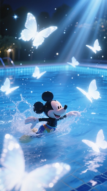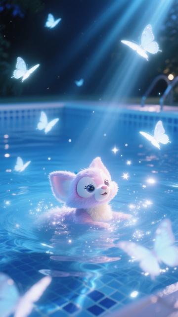 梦幻3D角色在泳池中嬉戏,蝴蝶环绕,光影交织,营造出童话般的卡通氛围。