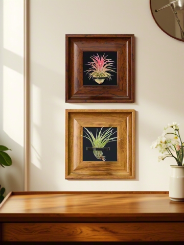 两张平行悬挂的白色棉麻绳上,用复古铜色木质衣夹分别夹着六张不同造型的白色相框,相框边缘有手绘风格的波浪纹和点状装饰,整体呈现温馨治愈的日系插画风格,所有元素悬浮于纯白色背景之上,光影柔和,营造出简约而富有艺术感的居家装饰氛围。