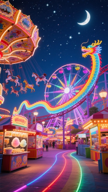 一艘龙舟造型的过山车在轨道上,巨大的龙头,车上坐着2个卡通三角粽子人偶,拿着气球,龙头为梦幻车头,车尾喷出多巴胺光焰;背景是梦幻游乐场,有摩天轮、旋转木马,气球彩带,彩虹,过山车下面有碰碰车等