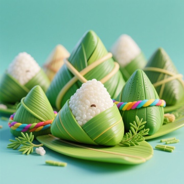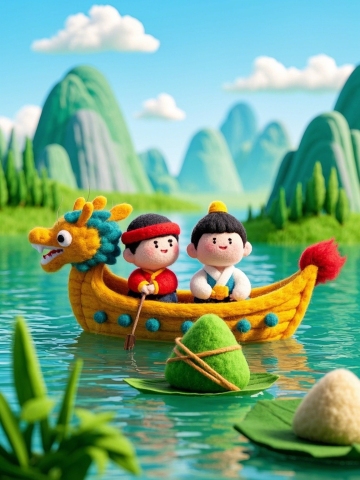 3D卡通风格,拟人粽子乘龙舟,波普艺术色彩,端午节欢乐场景。