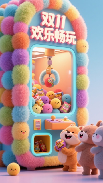 软3D风格抓娃娃机,毛发生长质感搭配萌趣动物,梦幻色彩营造可爱欢乐氛围,双11促销主题,趣味十足。