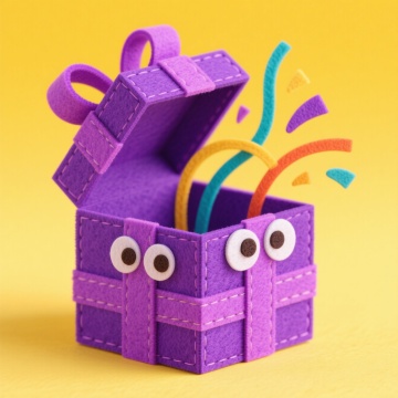 软3D风格的紫色毛毡礼盒,拟人化大眼睛萌趣十足,彩虹丝带跃出箱体,充满卡通感与趣味感,传递节日惊喜。