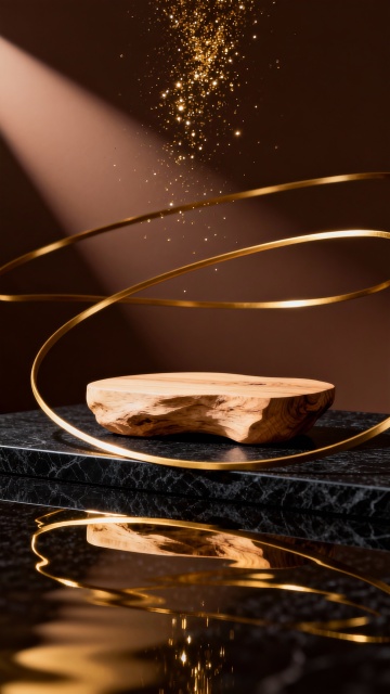 3D渲染的展示背景,整体采用温暖的金色、铜色和深棕色渐变色调,带有细腻的金属质感和磨砂纹理,表面装饰有连续的祥云纹样浮雕图案。画面由多个大小不一、形态变换的曲面构成,它们以交错层叠的方式排列,形成丰富的空间层次感和柔和的光影过渡效果。底部中央放置一个圆形的金色展台,展台表面光滑并反射着环境光,周围环绕的曲面造型在保持原有色调和纹理的基础上,变换为更具流动感的波浪形态,整体构图呈现出典雅而现代的东方美学风格,光影柔和,氛围庄重而富有高级感。