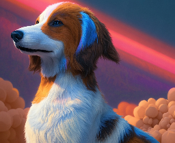 梦幻水彩风,小狗拟人化,身着轻纱,飘浮夜空,满月映衬,超现实童话场景。