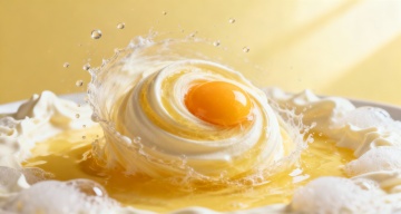 一个黄色布丁,白色的瓷盘,干净的厨房背景,糖果配色,主体突出。