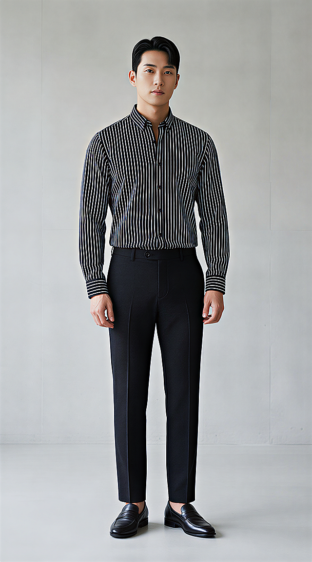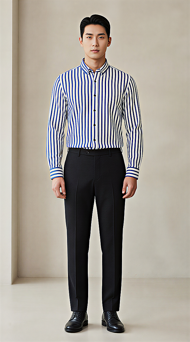 帮我生成一张一个身材较好的男模特穿上这件衬衫展示的全身模特图,模特要是偏韩风的亚洲人,图片中要展示衬衫的正面,袖子不要挽起来,下半身穿黑色的西装裤详情