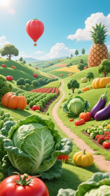 清新卡通风格,微缩艺术展现工人在巨大果实上劳作,趣味盎然。