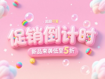 主标题为“促销倒计时”,副标题为“新品来袭低至5折”,立体泡泡字体,3D立体字,软边缘,字体采用粉彩棉花糖材质表面覆水光膜,字体透明,字体里面填充跳跳糖颗粒