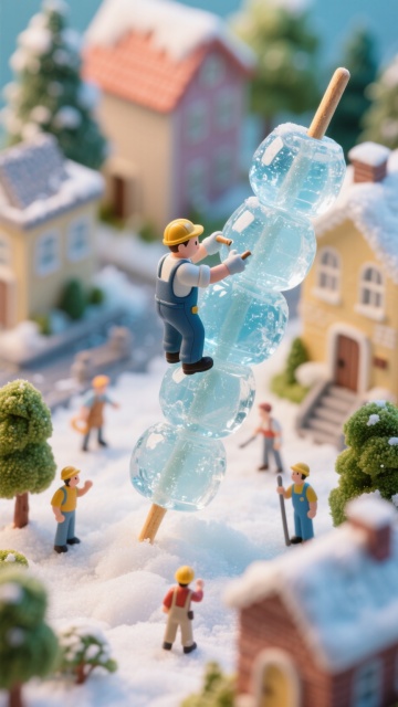 卡通3D风,微缩艺术展现梦幻趣味,小人堆砌冰块雪人,冬日童话场景。