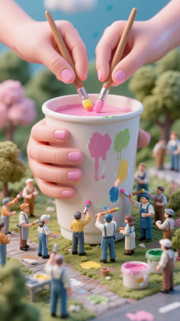 粘土风微缩艺术,卡通人物攀爬草莓山,梦幻超现实主义场景。