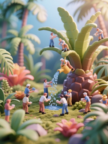 微缩景观,俯瞰视角,一群小人儿在制作一件巨大的衣服,有的在缝布,有的在裁布,有的在刺绣