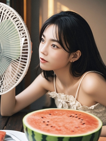 一个女生,夏天,风扇,西瓜