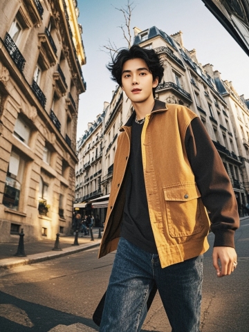 一个男青年(参考图),半身图,巴黎的街道上,黑色短发,穿着图上这件毛衣,比例是1350*455PX,超高清人像摄影,艺术肖像照,氛围感天花板